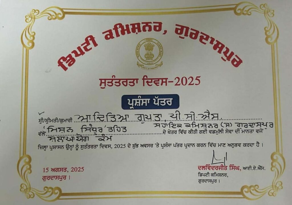 गुरदासपुर प्रशासन ने भी इसे जिले के लिए एक गौरवमयी क्षण बताया और कहा कि ‘मिशन सिन्दूर’ जैसे अभियान समाज में नई ऊर्जा और जागरूकता लाने का कार्य कर रहे हैं।