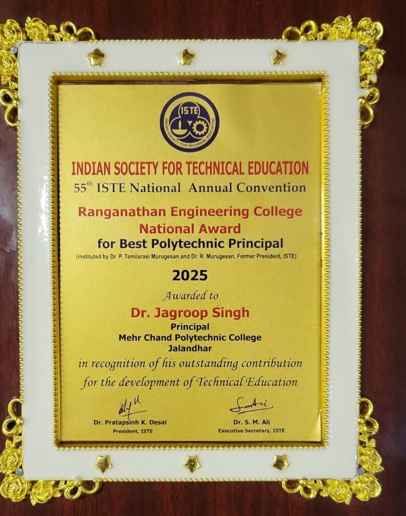 जालंधर ब्रीज: मेहरचंद पॉलिटेक्निक कॉलेज जालंधर के प्रिंसिपल डॉ. जगरूप सिंह को प्रतिष्ठित आई.एस.टी.ई. रंगनाथन इंजीनियरिंग कॉलेज नेशनल अवॉर्ड फॉर बेस्ट पॉलिटेक्निक प्रिंसिपल से सम्मानित किया गया। यह पंजाब और तकनीकी शिक्षा विभाग के लिए गर्व की बात है कि उनके एक पॉलिटेक्निक कॉलेज के प्रिंसिपल को अखिल भारतीय स्तर पर इस पुरस्कार के लिए चुना गया। यह पुरस्कार पूरे देश में हर साल केवल एक ही पॉलिटेक्निक कॉलेज के प्रिंसिपल को दिया जाता है।