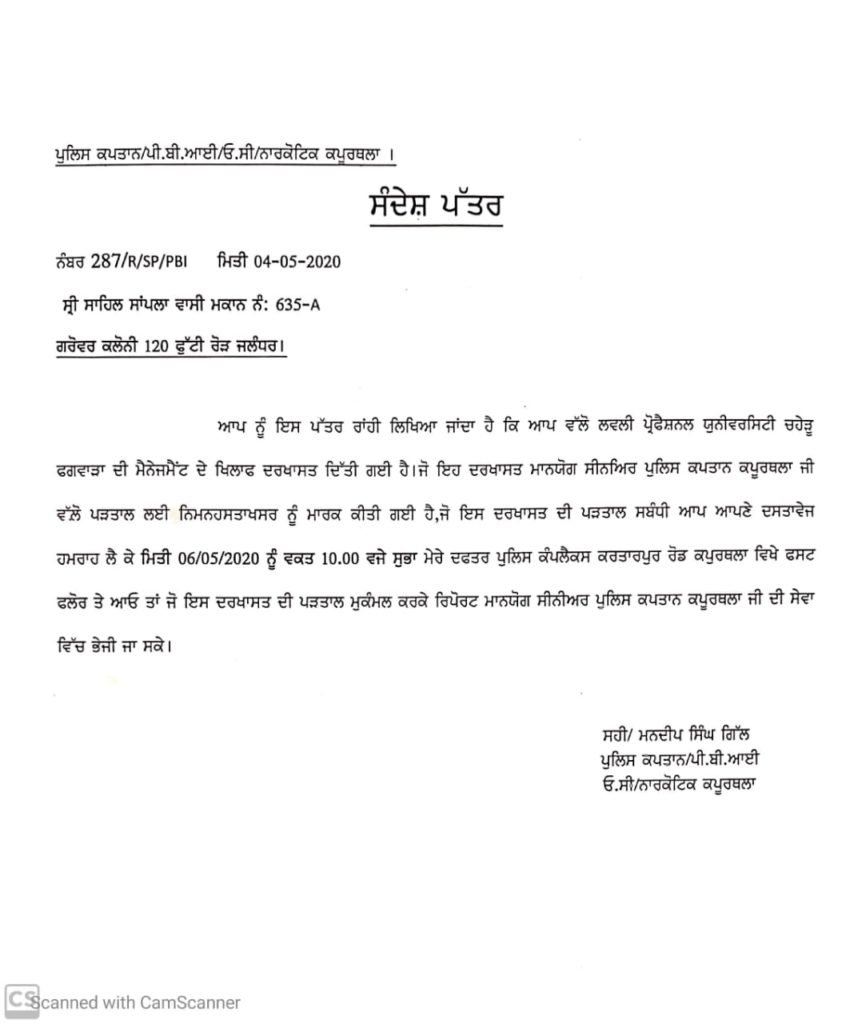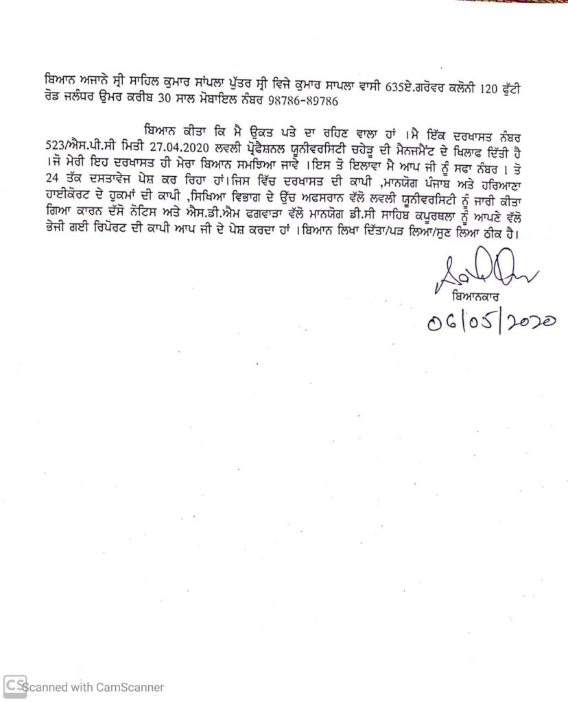 जालंधर ब्रीज: कोरोना महामारी ने पुरे विश्व को तो हिलाकर रखा ही परन्तु इस बिमारी ने कई उद्योगपतिओं की भी मुश्किल बढ़ाने का काम किया है जैसे की रोज़ सुनने में आ रहा है बड़े बड़े मीडिया घराने इश्तिहार का काम न मिलने से हाशिये पर चले गये और कई उद्योगपति मुलाज़िमों को पगार देने में असमर्थ दिख रहे है इसी लड़ी वार में जालंधर -फगवाड़ा रोड पर स्थित लवली प्रोफेशनल यूनिवर्सिटी भी काफी सुर्खियों में रही उसका सुर्ख़ियों में रहने का मुख्य कारण पिछले दिनों यहाँ एक महिला छात्र का कोरोना पॉजिटिव आना परन्तु आज की तारीख में वो महिला छात्र भी कपूरथला हॉस्पिटल से इलाज करवाने के बाद ठीक हो गई पर कुछ समाज सेवी और कुछ राजनीतिज्ञों द्वारा पिछले दिनों प्रबंधन के खिलाफ प्रदर्शन किये गए थे और लिखित शिकायतें प्रधानमंत्री, मुख्यमंत्री से लेकर उच्च अधिकारिओं तक को की गयी जिसमे एक शिकायत पूर्व केंद्रीय मंत्री के बेटे साहिल सांपला ने माननीय हाई कोर्ट में जनहित याचिका भी दायर की गयी जिसकों सुनने के बाद माननीय हाई कोर्ट द्वारा यह आर्डर किया गया की आप पहले शिकायत प्रशासनिक अधिकारीयों को दर्ज कराये अगर वहाँ सुनवाई नहीं होती तो मेरे पास दोबारा आने के लिए स्वतंत्र है। माननीय हाई कोर्ट के आदेशों की पलना करते हुए साहिल सांपला द्वारा एसएसपी कपूरथला को एक लिखित शिकायत दर्ज कराई गयी जिसमे एसएसपी कपूरथला द्वारा उन्हें ब्यान दर्ज कराने के लिए बुलाया गया जिस पर की साहिल सांपला द्वारा आदेशों की पालना करते हुए ब्यान दर्ज कराये गए अब आने वाले दिनों में देखना होगा की प्रशासन इस पर क्या कार्यवाही करेगा ?