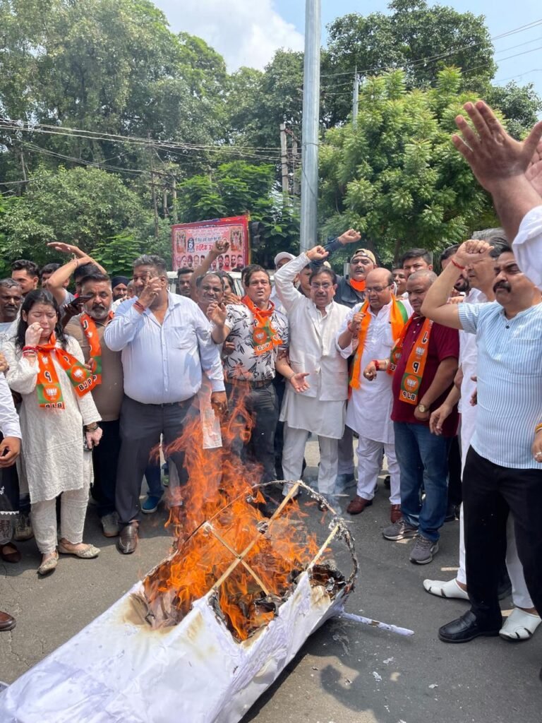 पंजाब सरकार का पुतला दहन करते हुए भाजपा पंजाब के महामंत्री राकेश राठौर, सुशील शर्मा,अनिल सच्चर, भाजपा स्पोर्ट्स सेल के प्रदेश अध्यक्ष सनी शर्मा,अश्विनी भंडारी, व अन्य